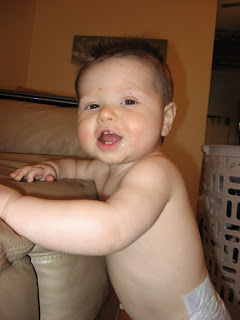 Here are some pictures of Jaren trying to keep on standing next to the couch. He eventually toppled over, but was a tough little tot and didn't even cry! He's also just too cute when he flashes me his cute smile when he plays with his toys.